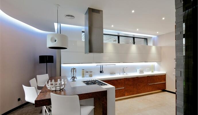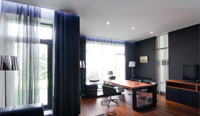 Интерьер стал логическим продолжением экстерьера: минимум стилистических жестов, максимум удобства и полезного пространства. На первом этаже — входная группа (с отдельным выходом в гараж), холл, гардеробная, большая двусветная гостиная, столовая зона и кухня, отделенная раздвижной стеклянной перегородкой; здесь находятся также гостевой санузел, кабинет и домашний кинотеатр, который по совместительству является еще и дополнительной гостевой комнатой. Второй этаж — зона личного пространства: пять спален (хозяйская, три детских и одна гостевая), гардеробная и две ванных комнаты. Из хозяйской спальни и детских есть выходы на просторную террасу. Чтобы среди детей (которых в семье трое и все — младше 7 лет) не возникло разногласий, где чья будет комната и какого цвета, детские сделаны в одной нейтральной гамме, а индивидуальность своим спальням дети придадут сами с помощью скрытой LED-подсветки и личных предметов.