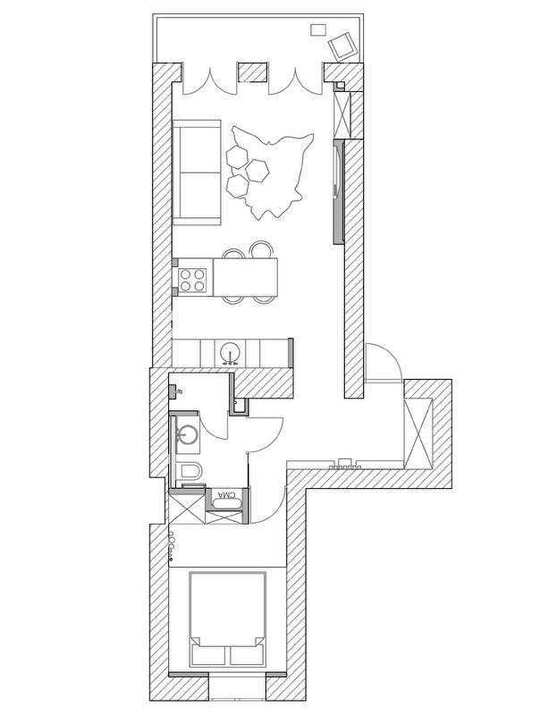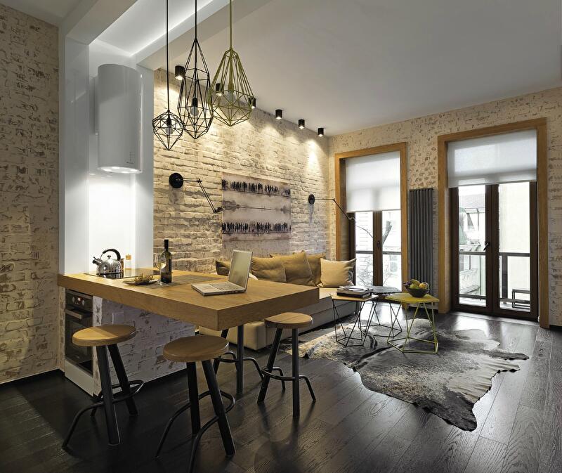 Стоявшая перед архитектором задача – создание современного интерьера с элементами старины для жизни одного-двух человек – решалась не только с помощью декора. Важным моментом была максимальная функциональность помещений. В результате перепланировки на месте крошечной кухни (2,3 х 2,7 м) появилась спальная комната. И если для кухни метраж был унизительным, то в спальне как раз поместилось все необходимое – и комфортное место для сна, и встроенный шкаф для одежды. Чтобы максимально сохранить открытое пространство, здесь даже не стали прятать в стены трубы, придав им дополнительную функцию – вешалки для одежды. А кухню полностью перенесли в пространство гостиной, тем самым четко разграничив публичную и приватную зоны.