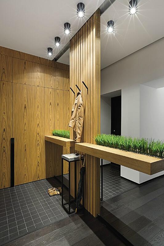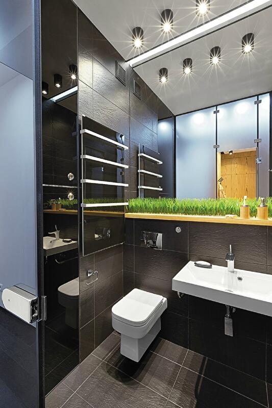Чтобы кухня-столовая-гостиная была наполнена естественным светом, до предела увеличили оконные проемы, опустив их до уровня пола, а также заменили глухие балконные ограждения на полностью прозрачные – из стекла. В борьбе за полезные сантиметры и визуальную легкость в ванной также использовали стеклянные двери и перегородки. А в прихожей за оптическое расширение узкого и длинного коридора отвечают огромные зеркала.