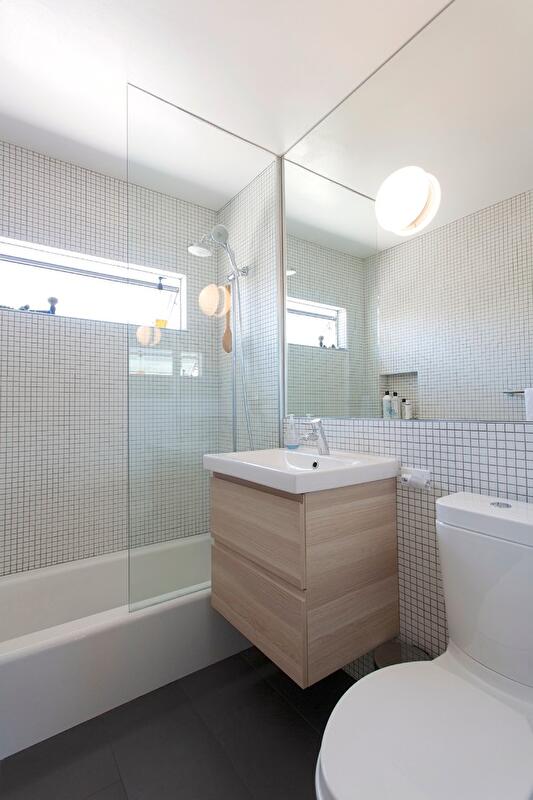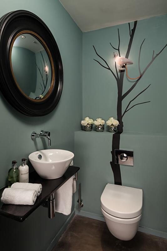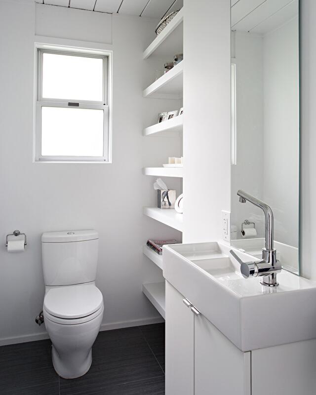 Используйте всевозможные подвесные полки, в том числе, в нишах. Открытые и закрытые маленькие шкафчики можно разместить вокруг зеркала — все необходимое будет у вас под рукой
