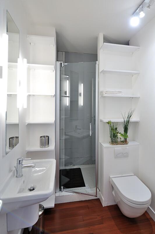 К примеру, в верхней части комнаты (под потолком) смонтируйте узкую прямую или г-образную полку с раздвижными дверцами. Она послужит антресолью для хранения средств личной гигиены, чистых полотенец и прочего.