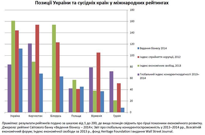 Несмотря на улучшение позиций Украины в рейтинге "Doing Business" Всемирного банка, условия существования бизнеса оставляют желать лучшего. Страна продолжает занимать позиции значительно ниже, чем соседи. Особо это заметно по таким показателям, как получение доступа к энергоснабжению, уплаты налогов и трансграничной торговли.