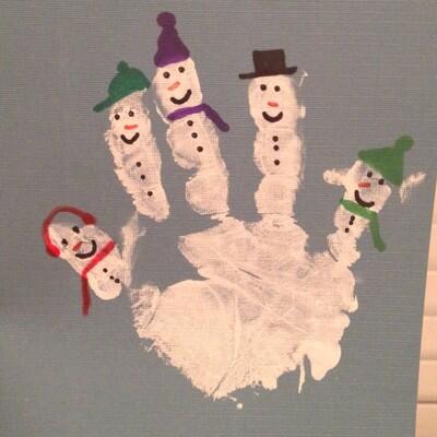 Для пальчиковой техники лучше купить специальные пальчиковые детские краски. Обмакните ладошку ребенка в краску и прижмите к бумаге, чтобы получился отпечаток. А затем подрисуйте снеговикам шляпки, глаза и носы с помощью зубочистки.