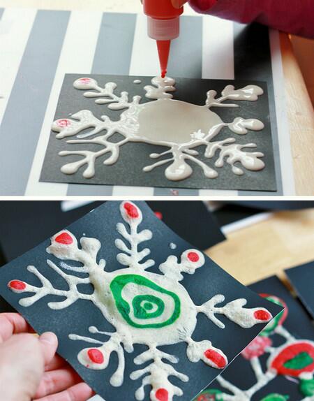 Мамы знают, как делать соленое тесто. Смешайте в одинаковых пропорциях муку, воду и соль. Налейте смесь в удобную емкость с дозатором (подойдет даже бутылка из-под кетчупа или пустая бутылка из-под жидкости для мытья посуды). Нарисуйте на бумаге снежинку, а если хотите ее украсить цветными деталями, добавьте в соленое тесто несколько капель пищевого красителя. Все готово! Нет, подождите! Теперь положите рисунок в микроволновку на 30 секунд, установив высокую мощность. Снежинка станет твердой и объемной. Вот теперь все!