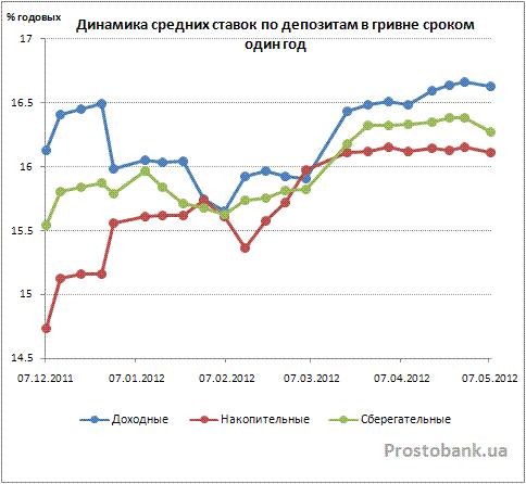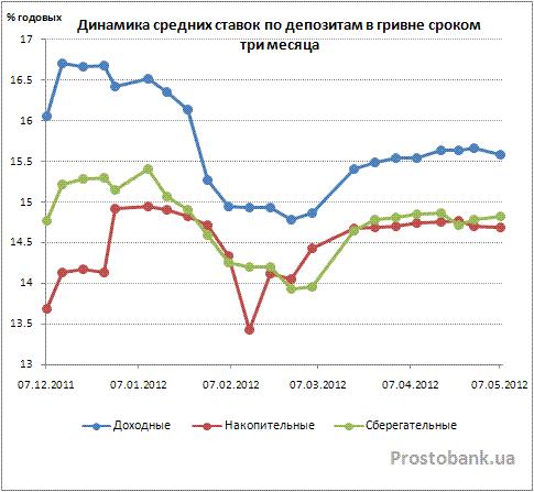 Так, средняя доходность вкладов в гривне преимущественно снижалась, в целом же за апрель-2012 она изменилась на 0,01-0,13 п.п. и составила 8,11-16,63% годовых. Средние ставки по вкладам сроком на год изменились в два раза больше, чем средние ставки по вкладам сроком на три месяца. При этом доходность по всем годовым вкладам снижалась, кроме доходных депозитов (с выплатой процентов ежемесячно или ежеквартально без права пополнения или частичного снятия), по которым средняя ставка увеличилась на 0,11 п.п. и составила 16,63% годовых. Эти же депозиты пока остаются самыми доходными их всех вкладов на рассматриваемые нами сроки.