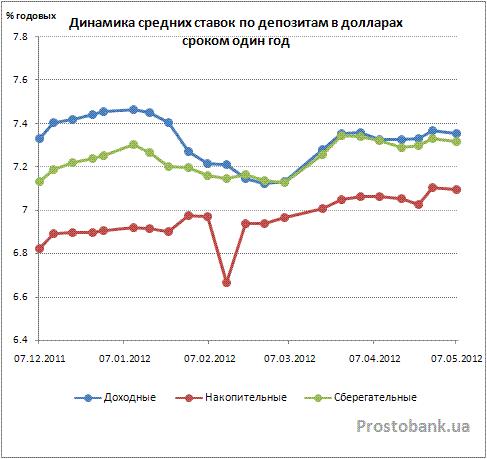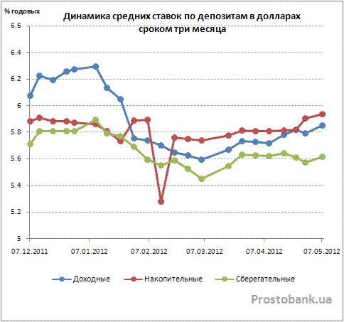 Что касается вкладов в долларах США сроком на три месяца, то здесь, впервые в 2012 году, ставки неожиданно продемонстрировали рост. Впрочем, как и в случае с доходностью вкладов в гривне, увеличение было несущественным – на 0,08-0,2 п.п., до 3,34-5,81% годовых. Ставки по вкладам в долларах сроком на год за апрель-2012 практически не изменились – всего лишь на 0,02-0,08 п.п., до 3,79-7,36% годовых.