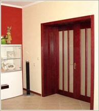 Распашные межкомнатные двери использованы для оформления входа в кухню (которая выполняет еще и функцию столовой) и в просторную гостиную. Такой выбор продиктован, прежде всего, наличием необходимого для распашных дверей пространства и для того, чтобы подчеркнуть торжественность помещения, где собирается за ужином вся семья, друзья, принимают гостей. Двери тонированы под «красное дерево», что выгодно сочетается с общим дизайном комнат. Особый шарм таким дверям придает матовое стекло цвета «белый сатин».