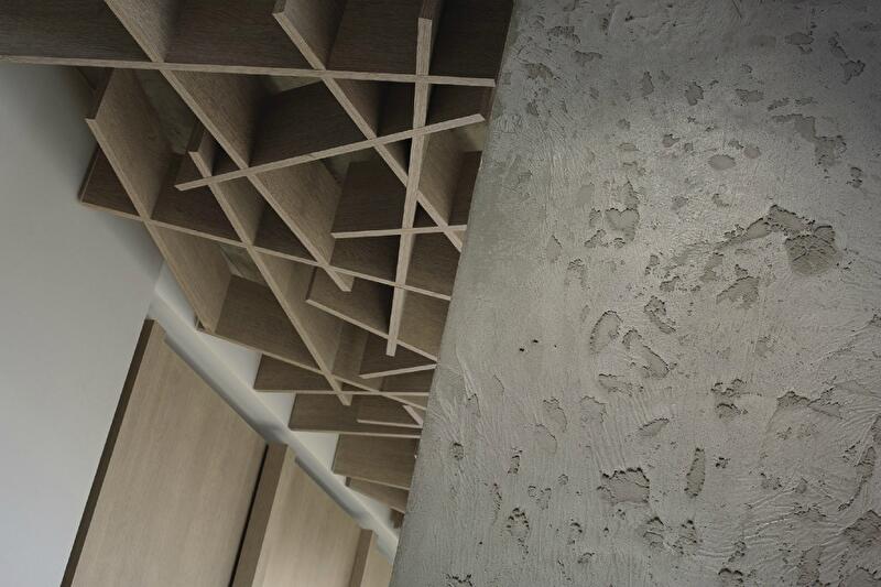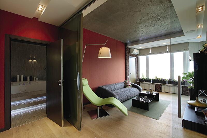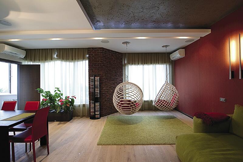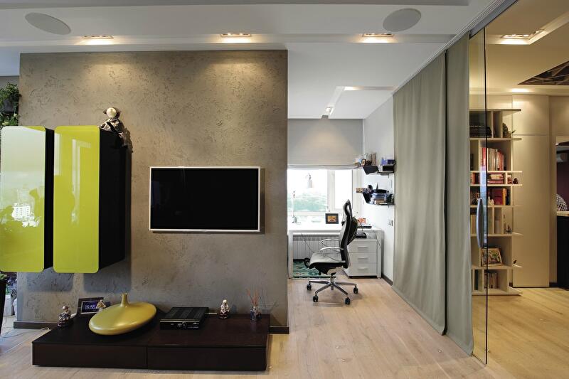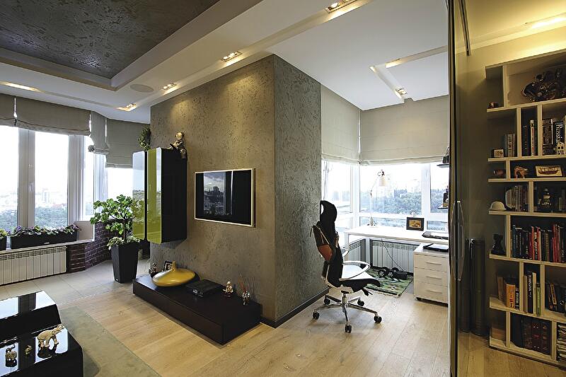 В результате этих бесед и последующих действий гостиная включила несколько зон: прихожую, лаунж с диванами, уголок с подвесными креслами-качелями у окна (для любования видами – 23-й этаж!), столовую-кухню, отделенную от коридора барной стойкой. В собранном виде диваны стянуты ремнями, а в разложенном превращаются в «арену цирка» по размеру полученной мягкой площади. Над диванами еще один любимый всеми элемент – полка для книг и сувениров в виде древесной ветки. Бетон, обилие дерева в отделке, уверенная работа с цветом – главные выразительные средства в дизайне гостиной. Отсюда через коридор мы попадаем в следующую комнату. Во время приема гостей она с легкостью может стать частью гостиной, но наличие стеклянных перегородок и, особенно, непрозрачных свободно перемещающихся текстильных панелей в любой момент превращает комнату в приватную территорию. Что иногда совершенно необходимо – именно здесь расположен небольшой рабочий кабинет.