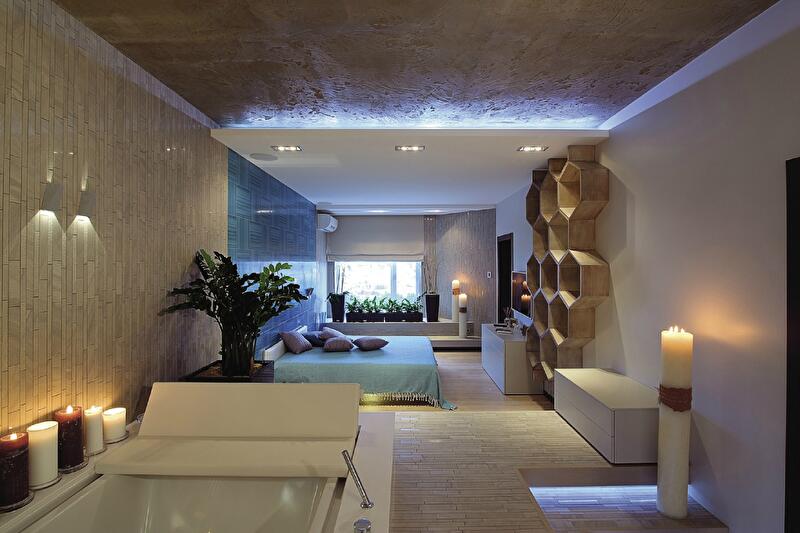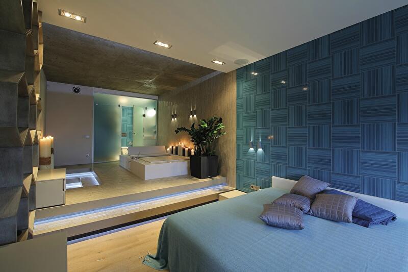 Дальше две двери в спальню. Казалось бы – многовато для одного помещения. Тем не менее, такое решение оправдано – комната имеет вытянутую форму и к своей основной функции прибавляет другую: в спальне находится также и ванна – открыто стоящая, роскошная, при необходимости прикрываемая панелями (в таком виде она служит массажной кушеткой). Получается, один вход ведет в зону воды, другой – в зону сна.