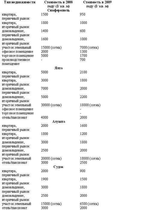 Мониторинг цен на жилую и коммерческую недвижимость в Крыму в 2009 году