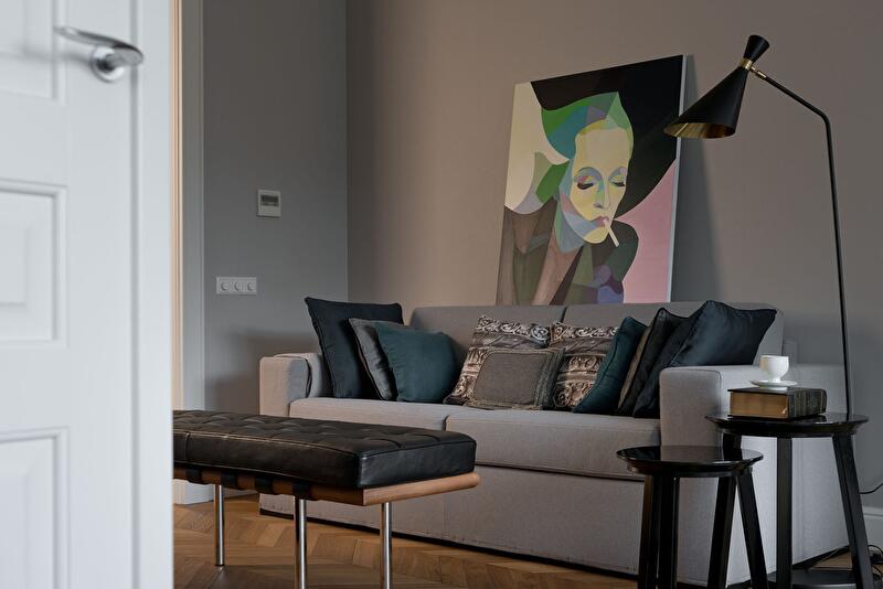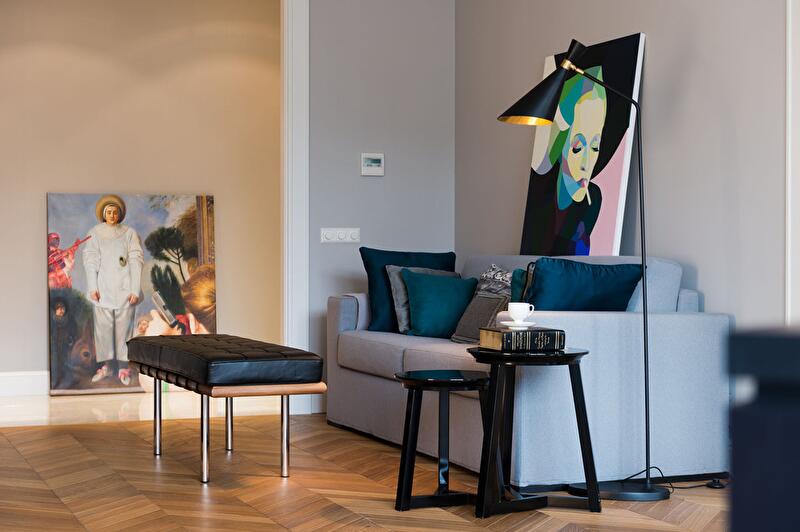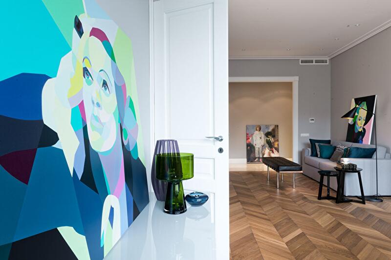 Выбор цветовой гаммы (как и стилистики) обусловлен вкусом заказчика, который хотел видеть ее монохромной. Меня эта задача не смущала: было интересно поработать с такой палитрой. Тем более что она стала прекрасным фоном для произведений современного искусства.