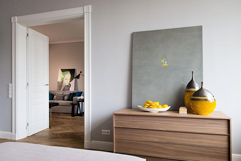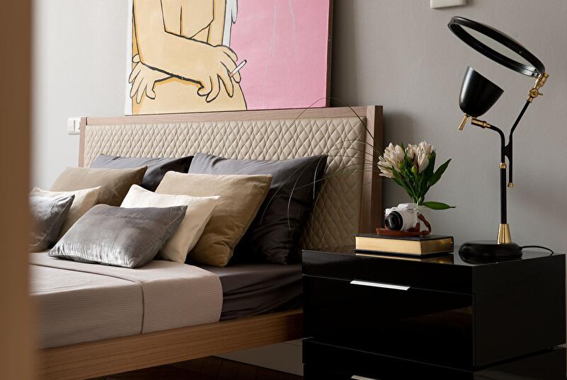 Кстати, в этом интерьере мебель так же, как и отделка, вторична: она лишь фон для коллекции живописи. А порой предметы мебели даже специально сливаются со стенами: например, комод от Jesse у окна гостиной. Или посмотрите на стильную кровать от Bimax в красивом деревянном финише и с кожаным изголовьем в спальне – разве может она соперничать с яркой ироничной картиной Михаила Гулина, стоящей в ее изголовье?