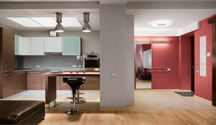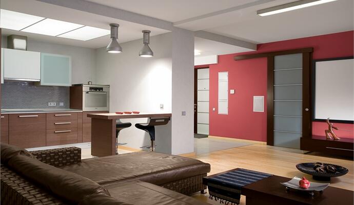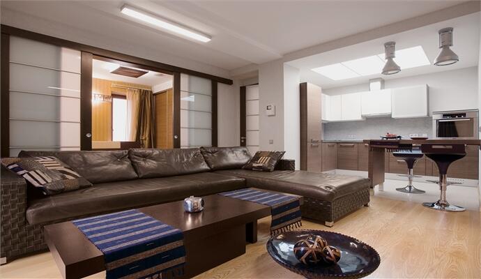 Одна из стен квартиры — красная. Владимир Погорельчук использовал такой ход, чтобы привлечь внимание гостей к зоне домашнего кинотеатра и разнообразить монохромность общей цветовой гаммы. Для создания камерной атмосферы окна оформили тяжелыми антрацитового цвета шторами, предотвращающими попадание прямого солнечного света внутрь. Небольшое пространство кухни отделено от гостиной барной стойкой из темного дерева, освещаемой алюминиевыми светильниками в стиле техно. Строгий кухонный гарнитур органично вписан в пространство кухни, одна из рабочих стен которой облицована монохромной фактурной плиткой в тон серебристо-серых стен. Зона спальни отделена сдвижной стеклянной перегородкой — прием, широко используемый в ориентальных интерьерах. Тема Востока обыграна здесь и в светильниках, обтянутых текстильной лентой коричневого цвета. По словам Владимира Погорельчука, это — интерьер с мужским характером. Здесь нет ничего лишнего, все функционально и стильно; в отделке применены кожа, дерево, стекло.