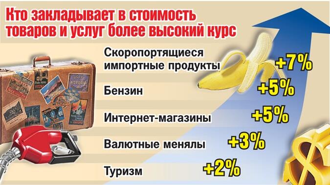 Баснословный курс доллара напрямую отражается на росте цен. В первую очередь дорожает весь импорт - бытовая техника и электроника, одежда и обувь, автомобили и продукты. Причем речь идет не только о бананах-ананасах, но и мясе, молочке, чае, кофе, сырах и многих других продуктах. И хотя объективно должны дорожать только импортные товары, из-за так называемых условных взаимосвязей подтягиваются цены и на то, что никакого отношения к импорту не имеет. Например, импортный сыр дорожает по объективным причинам, а отечественный уже просто его "догоняет".