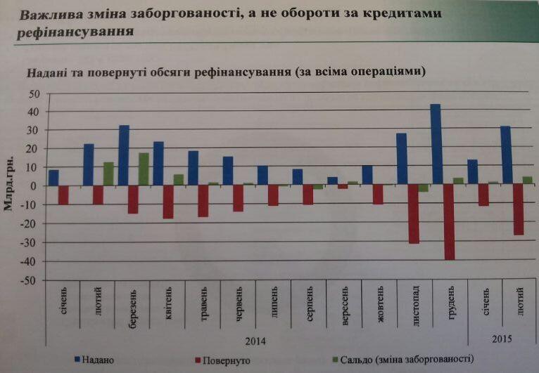 По данным НБУ, в течение 2014 года и января-февраля 2015 года банки получили кредитов рефинансирования на общую сумму 266 млрд грн. Вернули – 228 млрд грн.