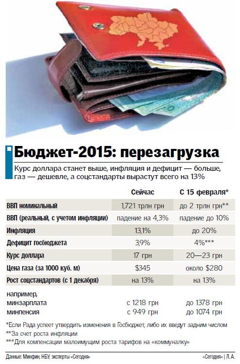 Официальных данных о том, как может измениться главная смета страны, пока нет. Яресько лишь сказала, что в ней увеличат показатель инфляции, курс доллара и предельный дефицит госбюджета, чтобы компенсировать малоимущим повышение тарифов на комуслуги. Но экономисты и наши источники в Минфине оценили, как поменяются некоторые макропоказатели (см. инфографику).