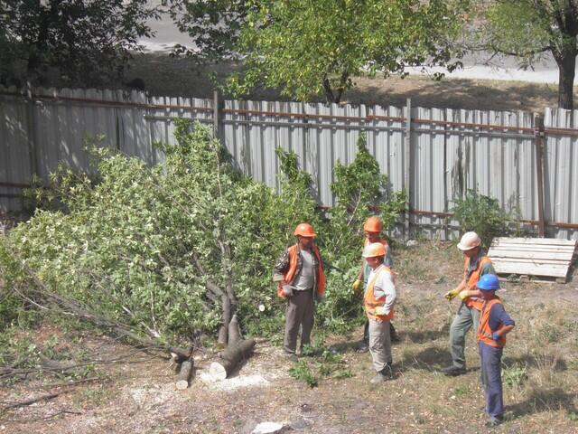За забором нещадно рубят деревья.