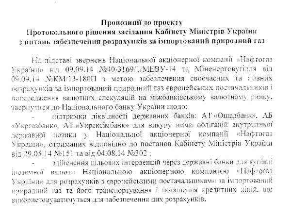 Об этом идет речь в предложениях к Протокольному решению заседания Кабинета министров по вопросам обеспечения своевременных и полных расчетов за импортный природный газ с европейскими поставщиками и избежания валютных спекуляций на межбанковском валютном рынке.