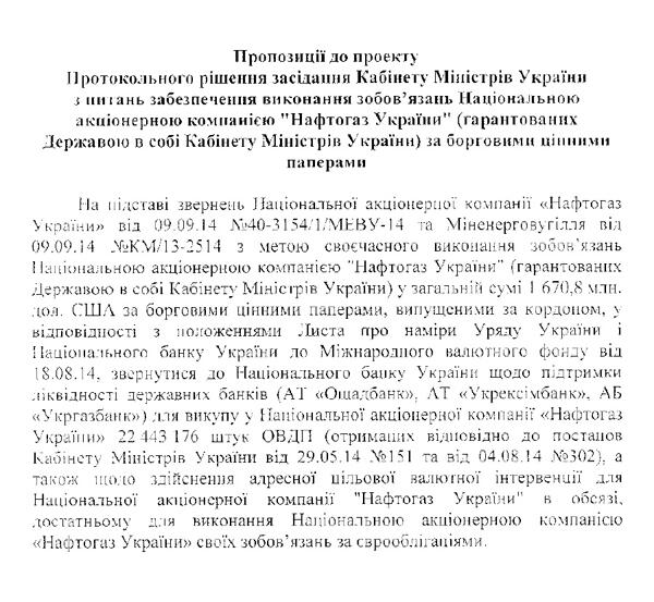 Как следует из документа, Национальный банк должен будет предоставить госбанкам средства "для выкупа ими облигаций внутреннего государственного займа у НАК "Нафтогаз України", полученных в соответствии с постановлением Кабинета министров от 29 мая 2014 №151 и от 04 августа 2014 №302".