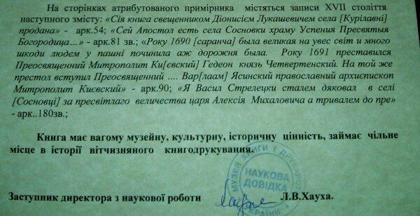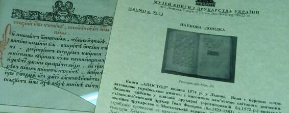 Те, що переді мною оригінал, підтверджувалося науковою довідкою Музею книги і друкарства України, підписаною заступником директора Л.Хаухою.