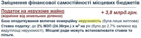 За словами експерта з питань бюджету Асоціації міст України - АМУ - Олександра Слобожана, пільги будуть тільки адресними і залежатимуть від майнового стану і рівня доходів. Вони надаватимуться тільки власникам житлової нерухомості. На комерційну нерухомість цей принцип поширюватися не буде.