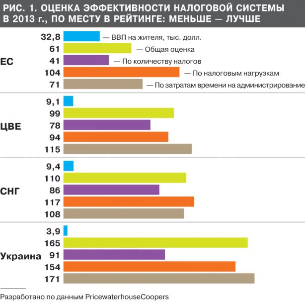 Вместе с тем по количеству налогов Украина занимает 91-е место в рейтинге среди 185 стран мира, ежегодно обследуемых Всемирным банком, по налоговой нагрузке — 154-е, а по затратам времени на администрирование налога — 171-е место. В целом среди групп стран, своих ближайших соседей — ЕС, ЦВЕ и СНГ — у Украины наихудшие оценки эффективности налоговой системы и ВВП на жителя (рис. 1).