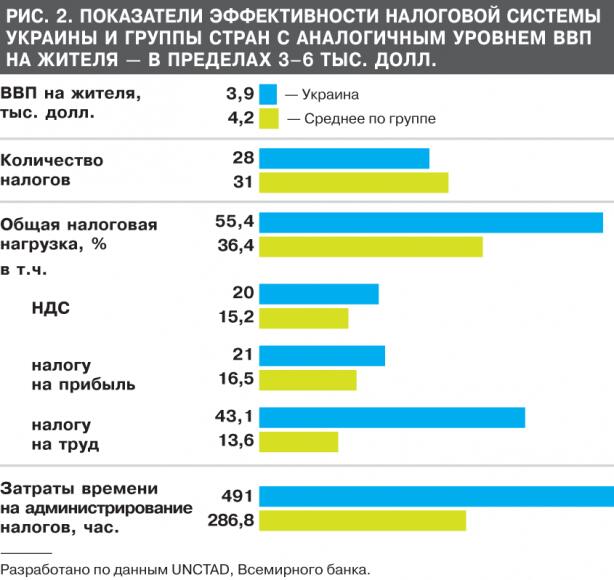 Возможно, сравнение со странами ЕС, в т.ч. со странами Центральной и Восточной Европы, входящими в евросообщество, недосягаемо для Украины? Но этого нельзя сказать о странах СНГ. Вместе с тем для большей объективности также сравним показатели налоговой эффективности Украины со странами, у которых аналогичный уровень ВВП на жителя по паритету покупательной способности (ППС). В эту группу стран с параметрами ВВП на жителя 3–6 тыс. долл. вместе с Украиной входят 35 стран из 185 обследуемых Всемирным банком. Кстати, в этой группе европейских стран единицы, в основном государства Центральной и Южной Америки, Юго-Восточной Азии, Северной Африки. Так вот, даже среди этих стран у Украины налоговая нагрузка значительно превышает среднюю по группе. В частности: а) по всем налогам — в 1,5 раза; б) по НДС и налогу на прибыль — в 1,3 раза; в) по налогу на труд — почти в 4 раза. При этом затраты времени на администрирование налогов в Украине почти вдвое выше средних по группе (рис. 2).
