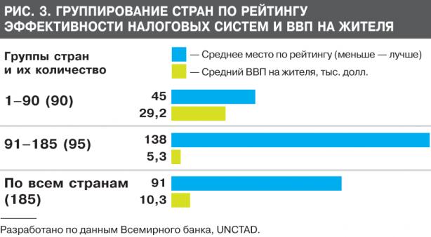 Кто-то может заметить: а при чем ВВП к налоговой системе, где тут связь? А связь непосредственная и достаточно тесная. Так, в странах, находящихся в первой половине рейтинга, с более высокой оценкой эффективности налоговой системы, средний уровень ВВП на жителя составляет 29,2 тыс. долл. Во второй половине стран, с более низкой оценкой эффективности налоговой системы, средний уровень ВВП на жителя — менее 5,3 тыс. долл. То есть средняя оценка эффективности налоговой системы по рейтингу во второй половине стран хуже в три раза, а ВВП на жителя — в шесть раз (рис. 3). Отсюда очевидный вывод: ключ от украинского прорыва к двадцатке наиболее развитых стран мира лежит "под сукном" налоговой реформы.