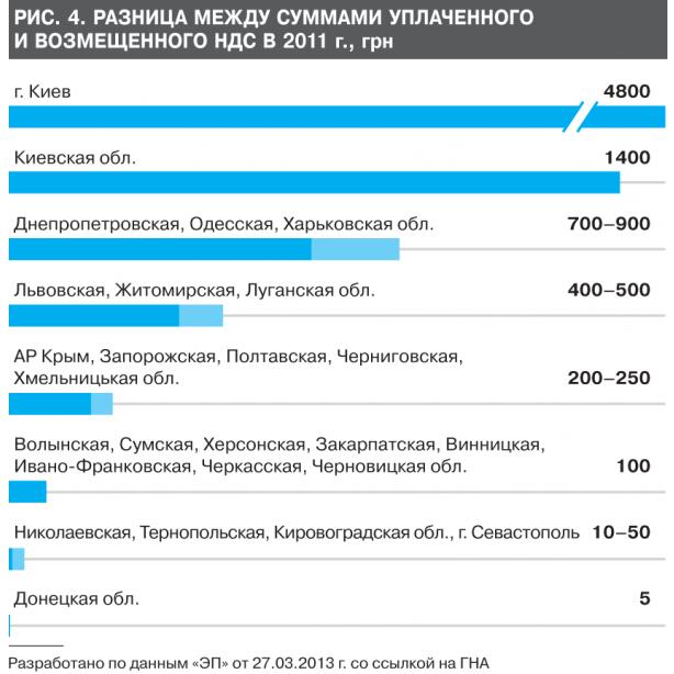 В Украине НДС является основным налогом и приносит около 30% доходов сводного бюджета. Но именно с этим налогом в Украине больше всего проблем. Почти 40% уплаченного НДС с произведенных в Украине товаров и услуг подлежит возмещению. Из надлежащих к возмещению сумм почти 40% не возмещаются. Почти четверть возможного НДС подпадает под льготы, в то время как в странах ЕС — менее 10%. НДС сложный в администрировании и создает большое пространство для различных манипуляций, "карусельных схем", фальсификаций с возмещением и т.п. О восприимчивости НДС к манипуляциям свидетельствуют, в частности, данные о разнице между уплаченными и возвращенными сумами НДС в регионах. Так, в Донецкой области эта разница составляла 5 млн грн, а в г. Киеве — более 5 млрд грн, т.е. в тысячу раз больше. Еще в семи областях, тоже являющихся крупными плательщиками НДС, эта разница в 100–300 раз больше, чем в Донецкой области (рис. 4). Две трети налоговых преференций приходятся на НДС. Вследствие этого бюджетная эффективность этого налога остается низкой — в пределах 40–50%. Все это закономерно спровоцировало недовольство НДС, призывы к его модернизации и даже замене или дополнению налогом с оборота. И это уже не только протестная реакция предпринимателей или домыслы ученых, а официальные предложения МДСУ.