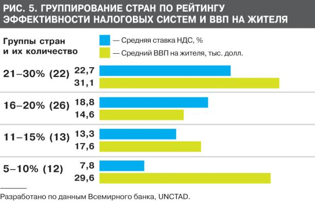 Указанные предложения могут иметь и другие недостатки. Уплата 2% налога с оборота может снизить конкурентоспособность многих групп товаров, особенно промышленности, вызвать торможение экспорта и рост импорта, ухудшение торгового и платежного баланса. Именно из-за этого многие страны в свое время заменили налог с оборота на НДС, а предложения относительно возврата назад, неоднократно в мировой практике рассматривавшиеся, всегда критиковали и отбрасывали. Действительно, среди 185 стран, обследуемых Всемирным банком, НДС существует в 150 странах и приносит около 20% всех налоговых поступлений. Основная положительная черта этого налога состоит в том, что он не оказывает негативного влияния на развитие экономики (по уровню ВВП на жителя). Анализ показывает, что уровень ВВП на жителя может быть довольно высоким и при высоких ставках налога (21–30%) и при низких (5–10%) (рис. 5).