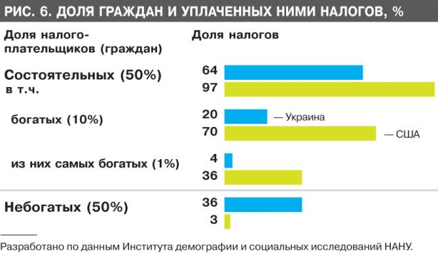 Очевидно, поэтому Украина, по оценкам международных организаций, оказалась на наихудших позициях межстрановых рейтингов по бедности и социальному неравенству. По данным ООН, за чертой бедности в Украине находится почти четверть населения. При этом бедные, средние, зажиточные и очень богатые украинцы платят практически одинаковые налоги — 15–17%. Социальное неравенство по доходам и равенство по налогам здесь отнюдь не согласовываются. По данным Института демографии и социальных исследований НАН Украины, зажиточные граждане (таких половина) в США платят 97% налогов, в Украине — всего 64%. Вместе с тем бедные граждане (вторая половина) в США платят 3%, в Украине — 36% налогов (рис. 6). Это свидетельствует о неотложной необходимости разработать в Украине эффективную систему налогообложения доходов физических лиц, которая остановила бы нарастание социального неравенства среди населения.