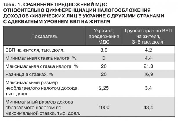 Что касается предложений МДСУ относительно усовершенствования системы налогообложения доходов физических лиц, то по своей сути они актуальны, но по смыслу есть серьезные предостережения. В Украине действительно сложилась очень упрощенная система налогообложения доходов физических лиц. Шкала налоговых ставок практически отсутствует. Отсутствует максимальный размер необлагаемого налогом дохода, а минимальный размер дохода, облагаемого налогом по максимальной ставке, очень низкий — всего 1,3 тыс. долл. Последний показатель в Украине в 30 раз меньше, чем в группе стран с параметрами ВВП на жителя в 3–6 тыс. долл., в которую входит Украина.