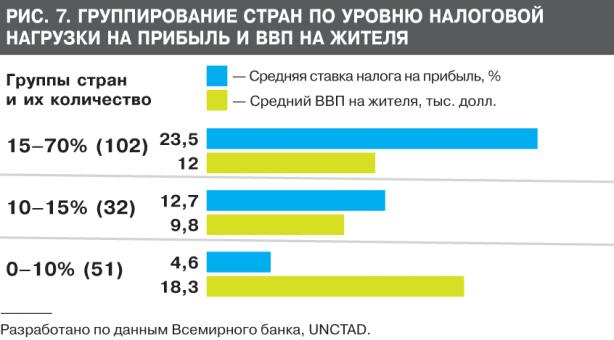 Между тем мировой опыт показывает, что этот налог оказывает ощутимое влияние на уровень ВВП на жителя. В странах с низкой налоговой нагрузкой на прибыль (ниже 10%) средний уровень ВВП на жителя (18,3 тыс. долл.) в 1,5 раза выше, чем в странах с высокими и умеренными налоговыми нагрузками (рис. 7). Поэтому страны, которые за 2007– 2013 гг. снизили налоговую нагрузку на прибыль (таких 110) и довольно существенно — в среднем на 9,2%, получили прирост ВВП на жителя вдвое выше, чем другие страны.