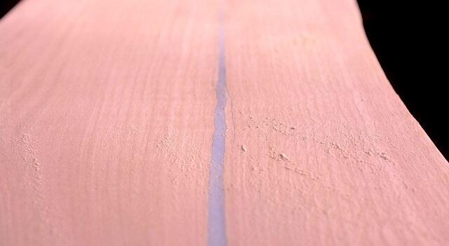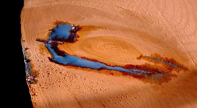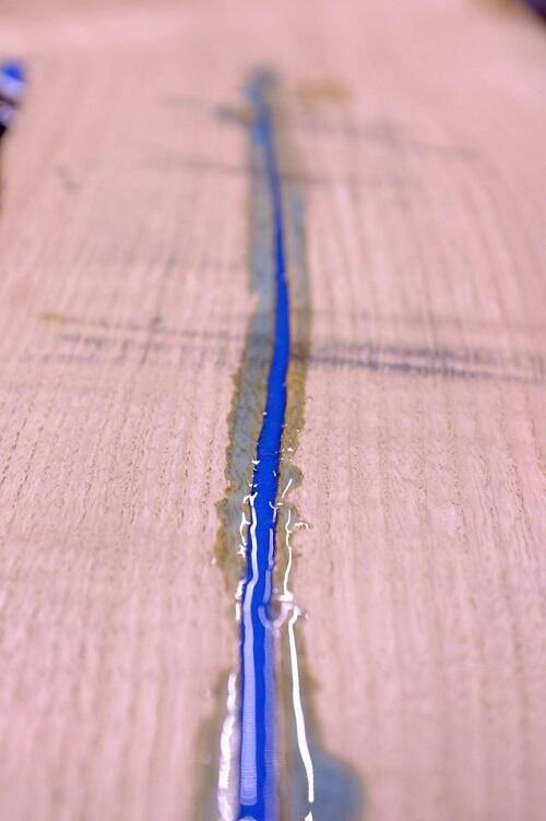 После этого приступаем к нанесению на будущую настенную полку светящегося узора. Пигментированную смолу заливаем в отверстия на доске. Внимание: залейте смолу в отверстие и приблизительно через час проверьте нет ли утечки с другой стороны. Если немного протекает, тогда наклейте еще один слой алюминиевой водонепроницаемой ленты. Оставьте смолу сохнуть.