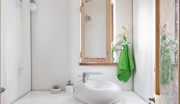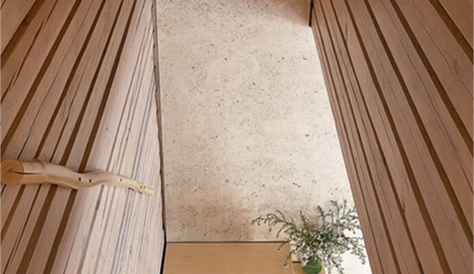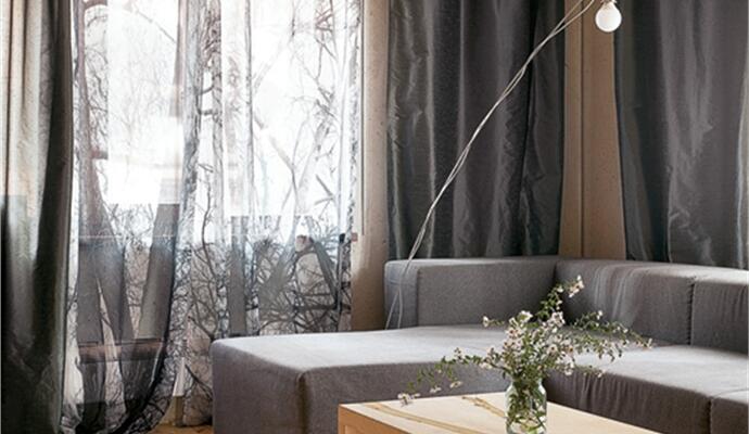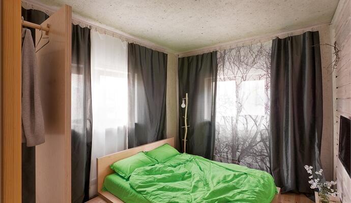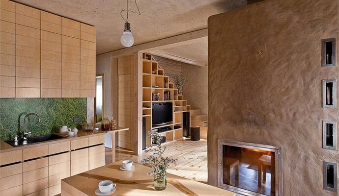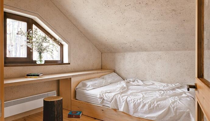 В интерьере использовались только «честные» материалы — глина, дерево, натуральный текстиль, а стены и потолок отделаны специальной шпаклевкой, замешанной с травой, так что видны травинки и листочки, чувствуется живая фактура и ощущается полная взаимосвязь с миром за окном — лесом и многолетними соснами. Простые линии и логика передвижения: на первом этаже — открытое пространство гостиной-столовой-кухни, гостевая комната и санузел; на втором — спальня, ванная комната и детская. И все же, при внешней незамысловатости, все досконально продумано, наполнено особым смыслом, который вкладывает бюро RYNTOVT DESIGN в каждый свой предмет или объект. И чем дольше здесь находишься, тем больше понимаешь, что простота эта и есть сложное решение.