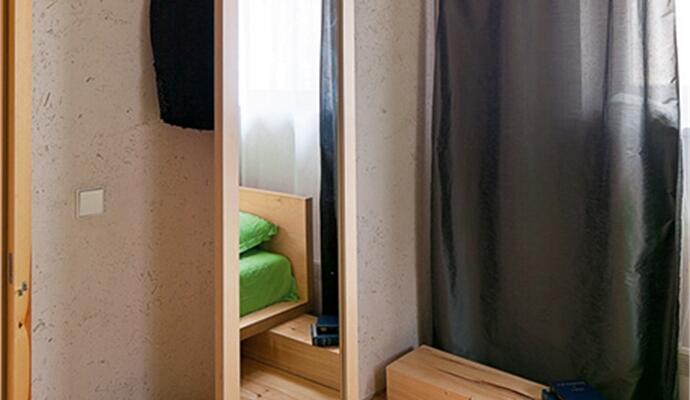 Учитывая, что за основу был взят сруб (типовой проект), собранный на металлических «шпильках», во избежание неудобств от его усадки, а также «сквозняков» из щелей,командаRYNTOVT DESIGN предложила нестандартный ход — выстроить интерьер, максимально (насколько это возможно) независимый от основной конструкции дома. Получился некий куб в кубе, с собственными «альтернативными» стенами.
