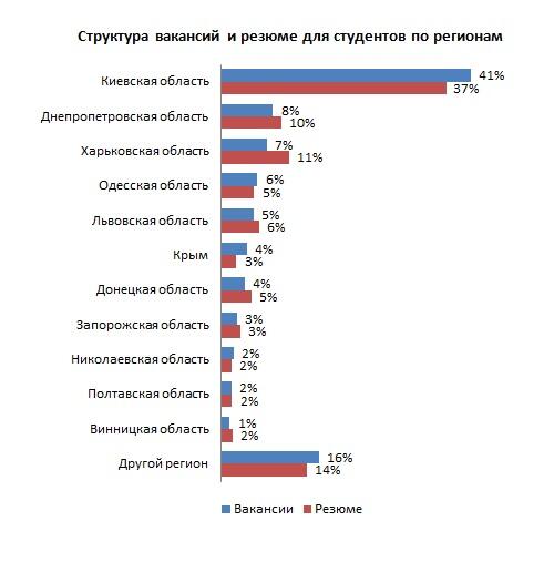 Если говорить о ситуации в регионах, то первое место по количеству как вакансий, так и резюме, занимает Киев. И это один из немногих городов, где количество вакансий превышает количество резюме. Аналогичная ситуация только в Одессе и Крыму.