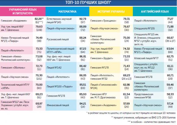 Также в топ-10 попали несколько специализированных школ, и нет ни одной обычной. И хоть многим из прошлогодних лидеров удалось остаться в числе сильнейших по результатам тестов (например, Украинскому физико-математическому лицею, Кловскому лицею, лицею №142, гимназии «Киево-Могилянский коллегиум», лицею «Лидер»), в самих десятках прошли заметные перестановки.