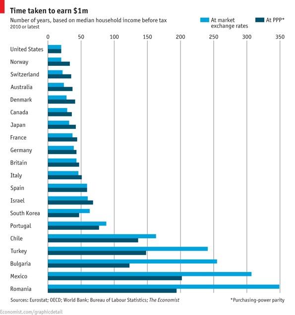 За лидерами выстроились Австралия, Дания, Канада и Япония, где для того, чтобы заработать буквально кучу денег, нужно отработать от 25 до 35 лет. Французам повезло еще меньше: у себя в стране им придется трудиться 40 лет, немцам – немного дольше. Впрочем, такой срок – ничто в сравнении со временем, которое уйдет на то, чтобы заработать миллион в государствах, оказавшихся в конце списка. Свой первый миллион житель Турции заработает за 240 лет, Мексики – за 305 лет, а Румынии – за 349 лет.