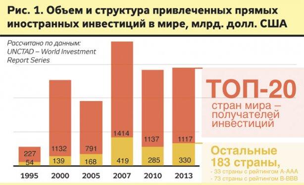 За внимание иностранного инвестора, за его инвестиции между странами идет жестокая борьба. Результаты этой борьбы для большинства участников неутешительны. Мировой рынок прямых инвестиций очень монополизирован — всего 20 стран мира получают около 80% всех инвестиций (рис. 1). Так, в 2013 г. из 1,4 трлн долл. инвестиций 1,1 трлн поступили всего в 20 стран, а 183 досталось всего 300 млрд (или 1,6 млрд в расчете на страну). Но среди этих 183 есть 33 страны с рейтингом А-ААА — они привлекают около половины из 300 млрд долл. Значительную часть из оставшегося получают 73 страны с рейтингом В-ВВВ. Остальные 77, включая Украину, конкурируют за оставшиеся "крохи" инвестиций. И эта тенденция не меняется уже 20 лет! Даже в наиболее благоприятные годы, когда инвесторы легче и быстрее раздавали инвестиции, группа "183 стран" получала все те же 10–20%.