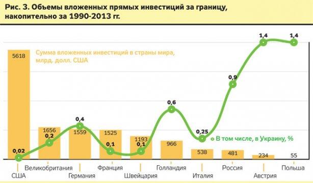 Отдельно стоит проанализировать инвестиционную активность (экспансию) главных торговых и дипломатичных партнеров Украины (рис. 3). Оказывается, за последние 23 года они вложили в другие страны мира колоссальные объемы прямых инвестиций. И, казалось бы, Украина как дружественная, перспективная страна с емким рынком должна бы их заинтересовать. Но результаты вычисления доли Украины в инвестиционных вложениях каждой из этих стран просто шокируют.