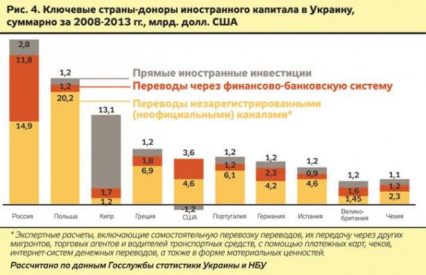 Для того чтобы окончательно убедиться, кто на самом деле верит в Украину, инвестирует в нее, мы сравнили объемы инвестиций и переводов из ключевых стран — доноров капитала за последние шесть лет (рис. 4). Даже результат сравнения прямых инвестиций только с переводами через финансово-банковскую систему заставляет преклониться перед мигрантами за то доверие и те миллиарды, которые они переводят в Украину. В среднем (без учета Кипра) они перечислили на родину в шесть раз больше, чем вложили иностранные инвесторы. А если учесть переводы по незарегистрированным каналам, то в 23 раза больше.