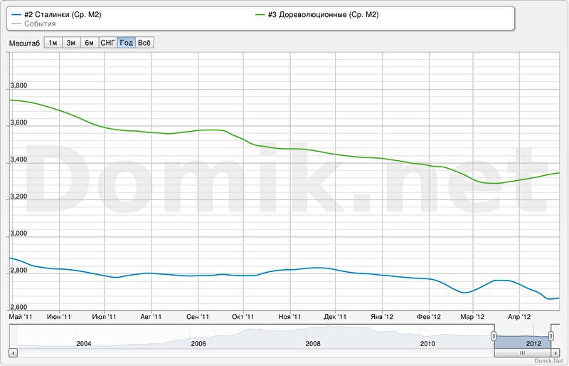 Синяя кривая — статистика цен в сегменте «сталинки»