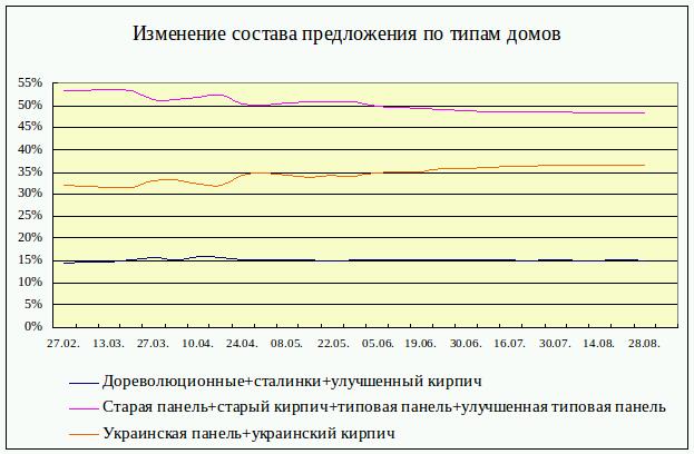 Как следует из графика изменения состава предложения по типам домов, за последние полгода заметно снизилась доля квартир в старых низкокачественных домах («старый кирпич», «старая панель», «типовая панель», «улучшенная типовая панель»). Квартиры в таких домах, в большинстве своем, малогабаритные, а потому стоят дешевле. При недостатке средств, покупатели вынуждены ориентироваться именно на такие квартиры.