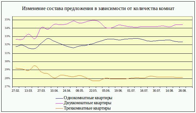 Весной в составе предложения увеличилась доля двухкомнатных квартир, снизилась доля трехкомнатных и однокомнатных. Летом особых изменений соотношения одно-, двух- и трехкомнатных квартир в составе предложения не наблюдалось.