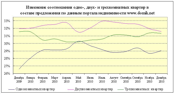 Вполне возможно, что получив официальные (полные) данные о количестве продаж одно-, двух- и трехкомнатных квартир в 2010 году, мы сможем более глубоко проанализировать изменения состава предложения, представленные на этом графике. А пока можем констатировать, что весь год в составе предложения преобладали двухкомнатные квартиры; трехкомнатных было на 0,5 – 2% меньше; однокомнатных еще на 1 - 3% меньше. А то, что в мае удельный вес однокомнатных резко увеличился, можно объяснить введением «Выписок из Реестра прав собственности на недвижимое имущество». Владельцы однокомнатных первыми среагировали на эти нововведения и постарались продать квартиры, не дожидаясь усложнения правил.