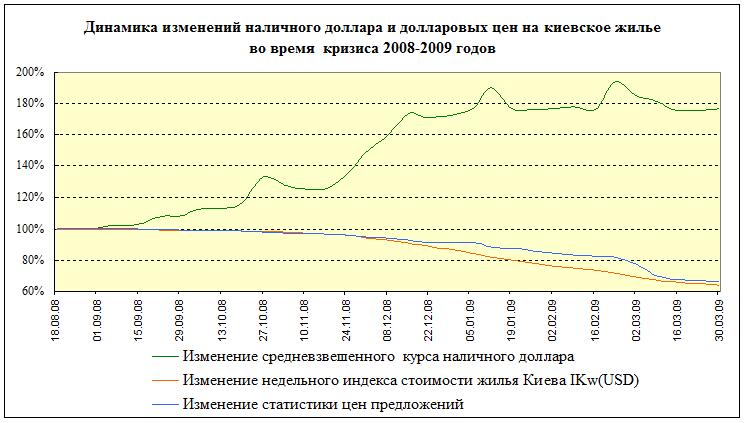 Курс наличного доллара заметно вырос еще в сентябре 2008, но долларовые цены при этом практически не изменились. В октябре 2008 года начался мощнейший финансовый кризис. Курс доллара резко прыгнул вверх. Рынок недвижимости отреагировал на это отменой принятых ранее договоренностей, резким сокращением количества сделок и весьма медленным снижением долларовых цен.