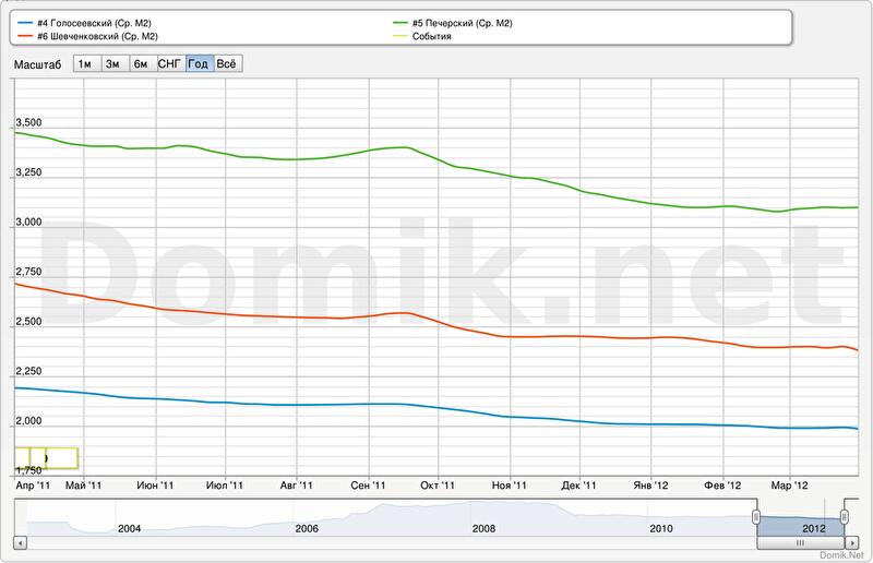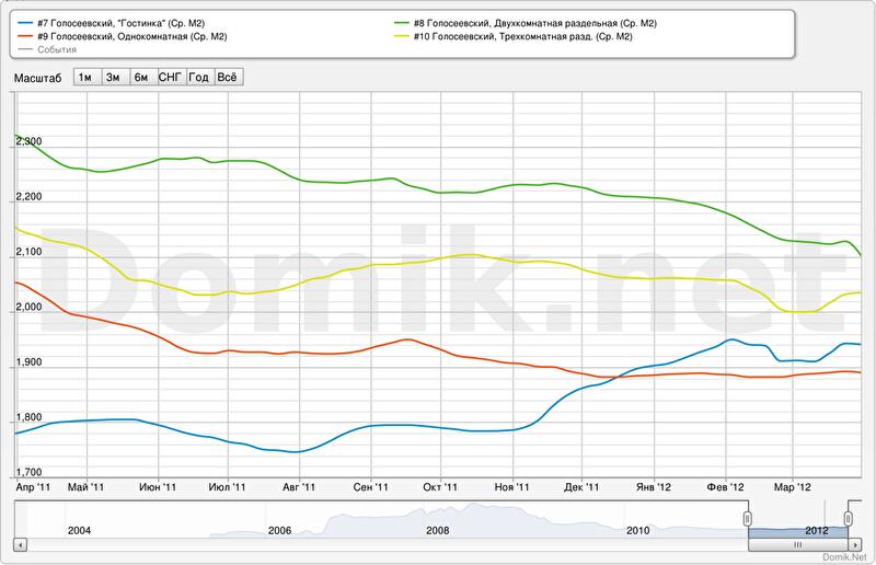 Налицо явное расслоение рынка в Голосеевском районе. Гостинки с начала осени 2011 года дорожают, цены на однокомнатные в последние месяцы стабильны, цены на двухкомнатные и трехкомнатные снижаются.