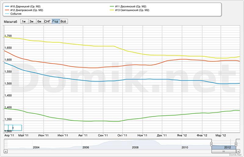 Начиная с октября, статистика цен предложений в Деснянском районе идет вверх. Есть тенденции к росту и в Днепровском районе. В Дарницком районе цены более-менее стабильны, в Святошинском плавно идут вниз.
