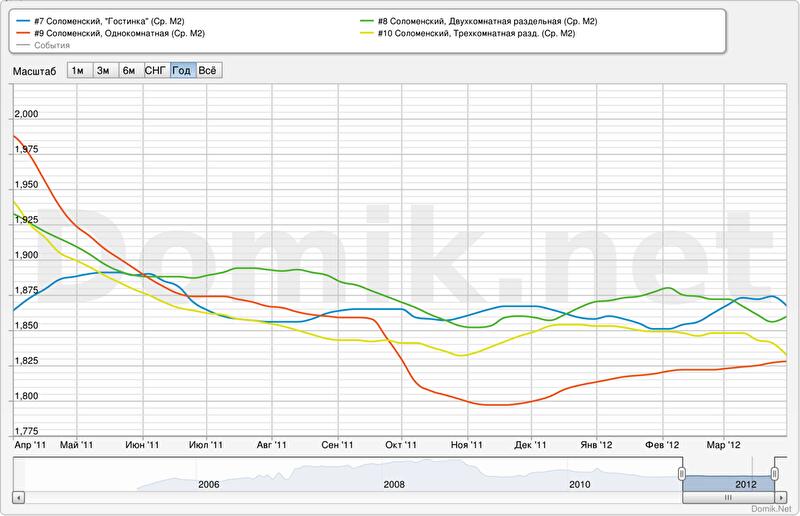 В последние месяцы статистика цен предложений на однокомнатные квартиры в Соломенском районе растет, на гостинки, двух- и трехкомнатные – колеблется.
